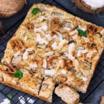 - Erdnussmus tröpfchenweise auf dem Teig verteilen, dann im vorgeheizten Ofen ca. 30 Minuten backen. 5 Minuten vor Ende der Backzeit mit den Kokosflocken bestreuen.